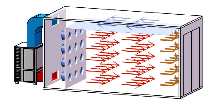 2,機組主要有上出風、下出風兩種結構(gòu),配套的烘(hōng)房形式多為:正壓吹風,負壓回風。